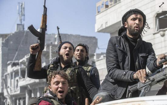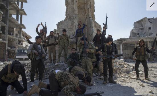 当地时间2017年2月23日,叙利亚阿勒颇,叙利亚自由军在“幼发拉底河之盾”行动中从“伊斯兰国”手中夺回阿尔巴布中心地区,他们兴奋地跪地庆祝。