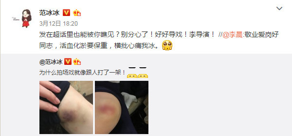 3月12日,范冰冰在微博晒出两张拍戏受伤的照片,并配文写道:“为什么拍场戏就像跟人打了一架!”照片中,范爷双腿淤青的十分严重。随后,李晨转发了该条微博,并创作了一副对联:“敬业爱岗好同志,活血化淤要保重,横批心痛我冰。”随后范冰冰也与李晨互动发文:“发在超话里也能被你瞧见?别分心了!好好导戏!李导演!”