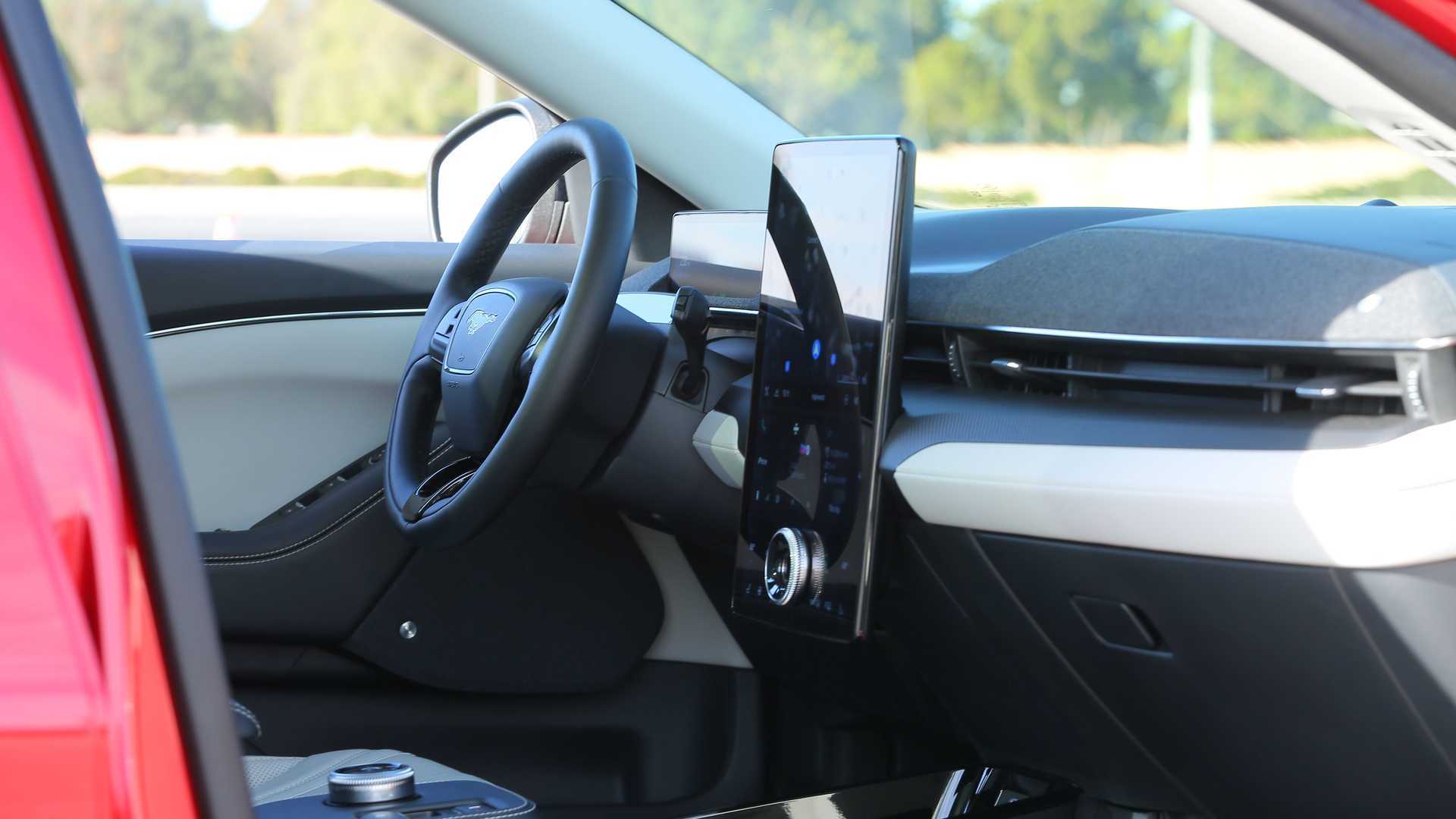 Mustang Mach-E一些外观设计上的细节之处巧妙地运用了空气动力学原理,例如——前格栅下部进气口中的可开闭饰板会根据需要打开和关闭,以冷却电池组。同时,Mustang Mach-E也是一款外形很“Mustang”,座舱却又很“现代”,将力量感与科技范融为一体的智能座驾。这种感受主要得益于Mach-E简洁的座舱布局,一台15.5英寸的中控大屏可以设置关于车辆的所有功能,屏幕中央的实体音量调节旋钮让传统实体按键的优势得以保留,可以放心进行“盲操”,提高了驾驶过程中的专注度。