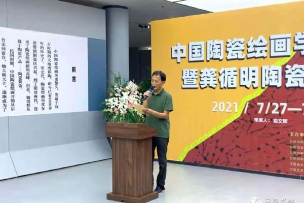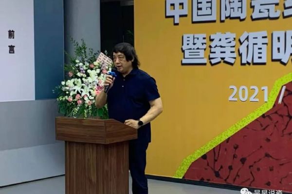 陶瓷艺术家、景德镇陶瓷艺术研究院院长何笠农代表协办方致贺辞。   开幕式最后由陶瓷艺术职业画家、“龚循明陶瓷艺术展”主创人员龚循明先生向来宾致欢迎辞。