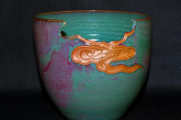 “祥云系列”之《云起云堕》——作品的造型是画缸的一种,刘志钧的本意是用浅浮雕在胎体的外壁刻画,但在雕刻的时候,中间的一条曲线刻得过深,使得整个云纹团的上半部掉了下来。在可惜之余,刘志钧又发挥出大胆的想象,经过仔细观察和思考,他顿觉这种“隔空呼应”的结果未必不是美的其他表现形式。正如“云起云堕”是一种偶然,也是一种必然,它或许已飘向远方,它或许已堕在瓶底,人生不也如斯吗?