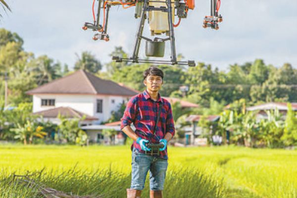 近年来,中国制造的农业植保无人机助力泰国农业生产更加高效安全。图为一名泰国农民操作大疆农业植保无人机。