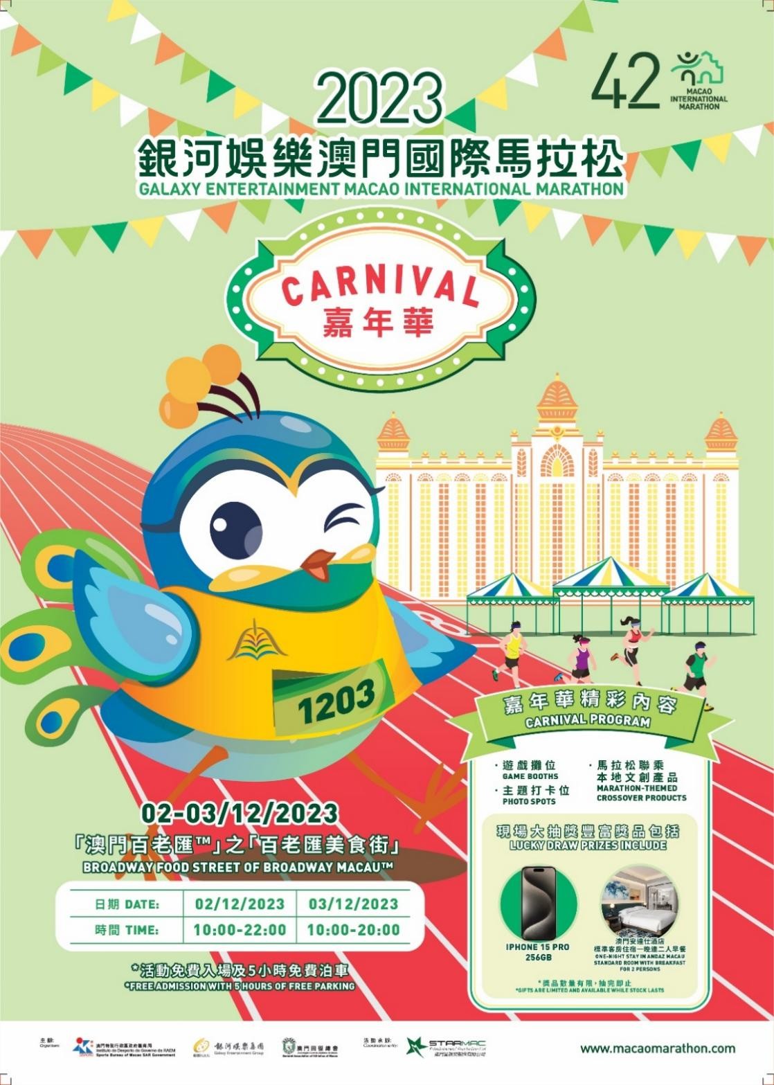 中华人民共和国澳门特别行政区(2023年11月29日)— 由澳门特别行政区政府体育局、银河娱乐集团(下称「银娱」)及澳门田径总会主办的「2023 银河娱乐澳门国际马拉松」将于 2023 年 12 月 3 日(星期日)举行;而一直广受欢迎的周边活动「银河娱乐澳门国际马拉松嘉年华」亦将于12月2日至3日在「澳門百老匯™」之「百老匯美食街」进行。一连两日的嘉年华涵盖「体育」、「娱乐」、「美食」及「文创」等丰富元素,由打卡装置、免费游戏摊位、街头演艺娱乐表演、零售文创到现场大抽奖活动等,多角度展现澳门体育旅游的魅力;此外,今年的活动更进一步提升亲子元素,让来自世界各地的参赛者、旅客、亲子家庭及澳门居民均能以多元方式投入此年度马拉松庆典,感受浓厚的马拉松气氛。