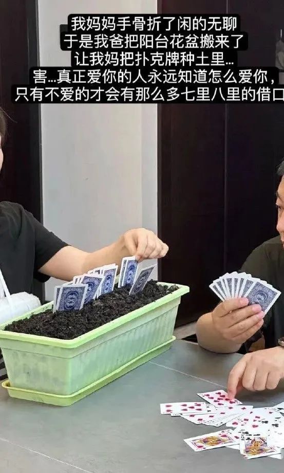 妈妈的手骨折了,闲得无聊,爸爸就把阳台的花盆搬来,让妈妈把扑克牌种进土里。