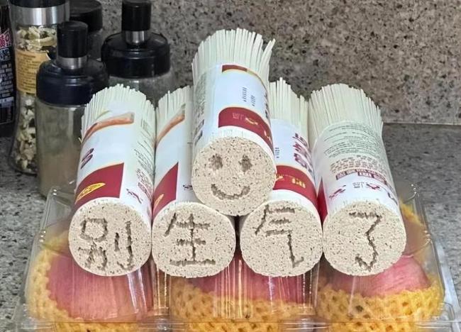 爸爸惹妈妈生气以后,在挂面上摆出“别生气了”的字样来哄妈妈开心。
