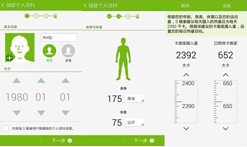 打开S健康应用,生机盎然的界面就赫然呈现。初次使用,用户需要输入姓名、性别、出生日期、身高、体重、运动状况等基础信息,S 健康根据信息给出相应的每日步数计划。当然,用户也可以根据自己需求设置个性化的健身目标。