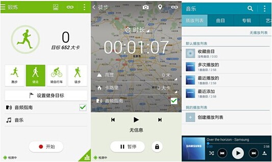 想要在生活中也能得到系统的健身训练,S健康的锻炼模式将为您提供私人教练一般的指导。四种基本的锻炼模式:跑步、健走、骑自行车、徒步,每一种模式都可以独立设定健身目标。用户可以选择自己偏好的运动类型,例如跑步,然后设置距离、时间和热量目标。当运动开启,S健康还会自动弹出所在城市的地图,通过GPS来计算跑步的距离。用户还可以随时开启音乐,在轻松愉悦的氛围中完成锻炼。