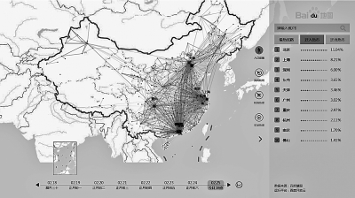 在百度迁徙实时地图上,每个人的转移就会清晰体现在密密麻麻的线条之中。