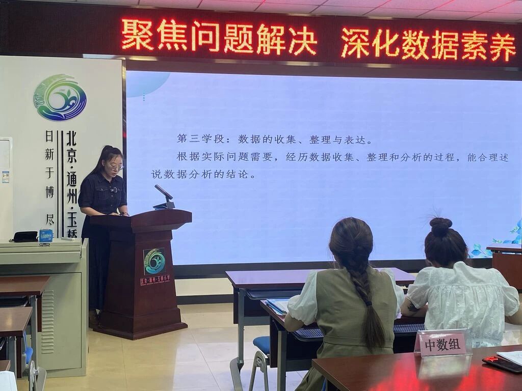 在单元整体教学汇报环节,由张雅慧老师进行研究内容阐述。以“基于问题解决的数据整理与表达”为主题,从课程标准解读、学业要求、单元教材分析、学情分析、课时安排与学习路径设计几个方面展开汇报。