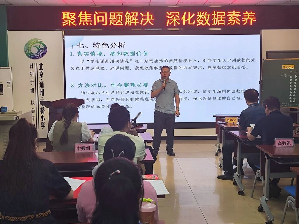 最后,彭主任做活动总结,对专家指导表示衷心感谢,并提出学校数学教学改进方向。此次活动为玉桥小学数学学科发展提供了清晰的行动指南,学校将以“数据意识主题教学”为突破口,深化单元整体教学设计研究,建立“问题导向—素养导向—实践导向”的课堂教学新样态。同时,学校将继续利用“大教研”形式,开展数据主题教学的持续研究与实践,推动教师专业能力与学生核心素养的协同发展。